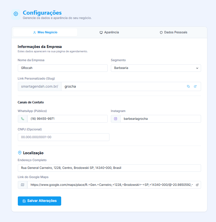 O primeiro passo é definir a cara do seu negócio. É aqui que você escolhe o nome que aparecerá para os clientes e, o mais importante, o seu Link de Agendamento.