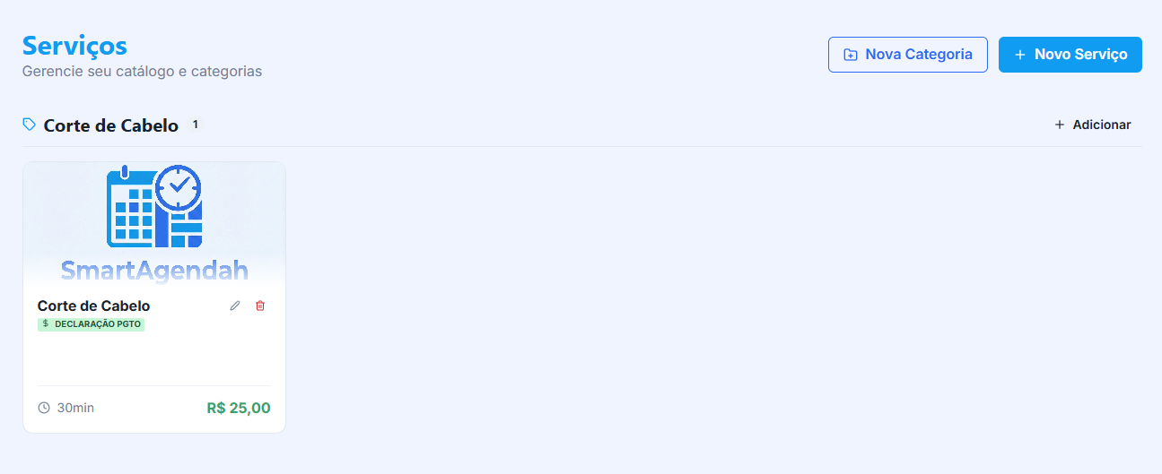 O que você oferece? Cadastre cortes, barbas e tratamentos. Primeiro, veja sua lista de serviços: