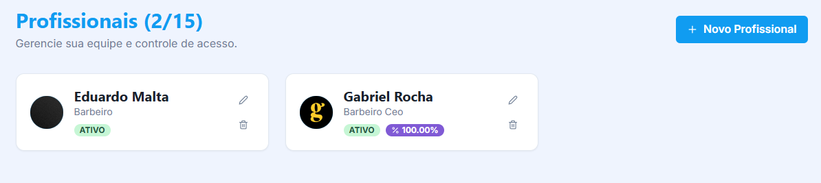 O plano gratuito permite apenas 1 profissional (você). Para cadastrar sua equipe (2 ou mais), é necessário assinar o plano PRO.
