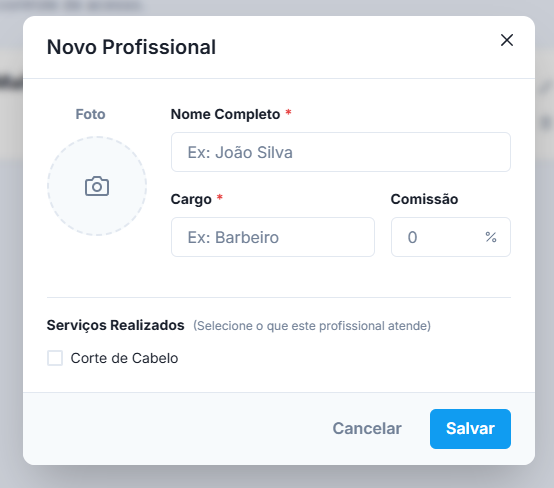 Ao clicar em "Novo Serviço", defina o preço e a duração. A duração é crucial para o sistema calcular os encaixes na agenda.
